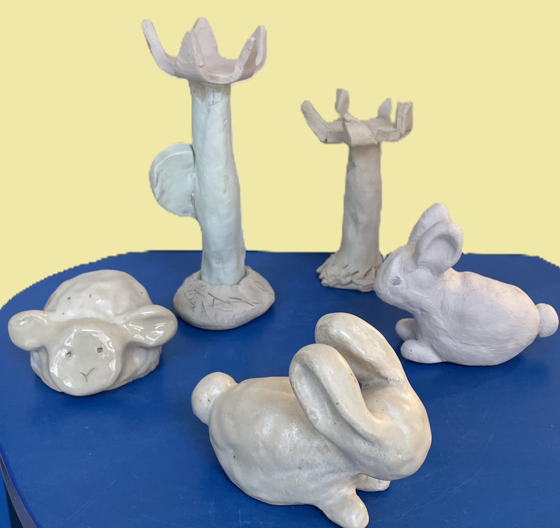 One class (week I) is designed to introduce or deepen hand building techniques: participants learn the basic techniques of hand building the pieces in two sessions, and the last session is reserved for painting their work with engobes. Spring is in the air, and we use that as inspiration to create decorated egg cups and Easter animals. After the class, the studio will glaze all pieces in transparent glaze which renders them food safe (can be picked up after 3 to 4 weeks).